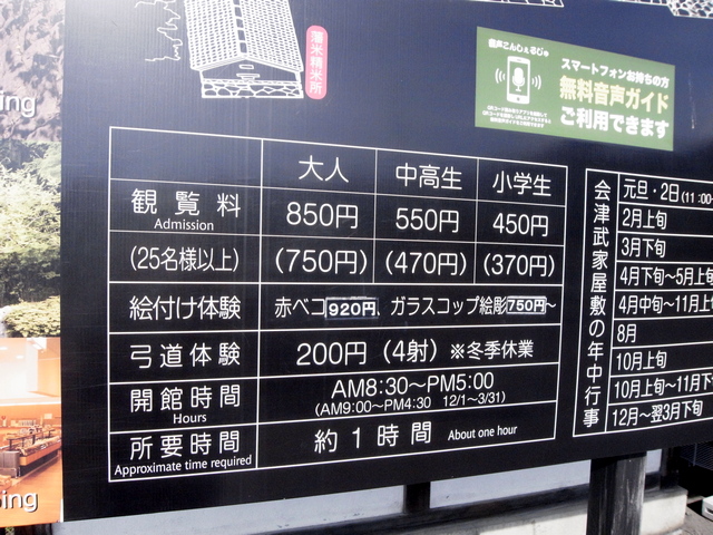 会津若松城天守入場券が 410円(茶室込みだと 510 円)。それと比べると、現存でもない復元武家屋敷で 850 円は、やはり割高に感じます。史跡でもないから、このくらいの値段じゃなきゃ経営していけないのでしょうが。