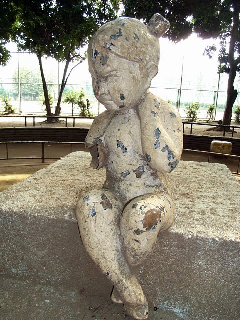 古びた像。経年によって表面は剥げ腕の一部は壊れてしまっているが、それによってこの像の芸術的価値・迫力といったものは高まったのではないかと思う。