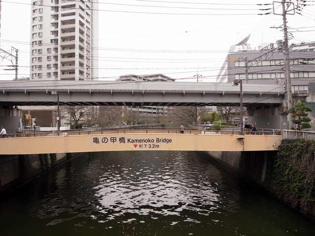 亀の甲橋を過ぎたところから「目黒川の桜並木」が始まり、目黒区に入ります。実際の区境は桜並木が始まって170mくらい上流にあるみたいですが。